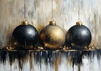 Gouden Kerst - Dit Kerst schilderij toont drie grote, glanzende Kerstballen in prominente zwart en goudtinten op een strak, neutraal wit en grijs achtergrond, gesierd met subtiele spatten van kleur en licht die een warme, feestelijke sfeer uitstralen.