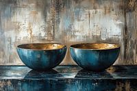 Gouden Kommen | Reflectie van Goud en Blauw - Dit moderne schilderij toont twee goudkleurige binnenkanten van kommen tegen een achtergrond met aardetinten en blauwe verticale strepen, waarbij de reflectie op een glanzend oppervlak een gevoel van diepte en rust uitstraalt.