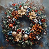 Gouden Krans - Dit is een kerstkrans schilderij van een modern, realistisch kerst schilderij waarop een rijke, textuurrijke krans van dennentakken met dennenappels, kerststerren, rode en blauwe bessen en glanzende gouden kerstballen tegen een koel grijsblauwe achtergrond staat, een schilderij kerstkrans in impasto-stijl met veel groen,…