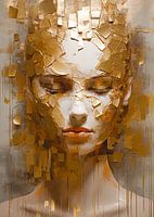 Een schilderij van een vrouw, bedekt met gouden papier, siert dit kunstwerk met de stijl van gefragmenteerde vlakken. Het biedt een verbluffende vorm van realisme, vergelijkbaar met de precisie van ZBrush-software. De vrouw straalt elegantie uit, met een gezicht dat emotie en diepgang toont, terwijl ze gehuld is in het glanzende goud van het papier.