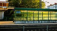 Een glazen wachthokje in diepgroen baadt in warm avondlicht; rails op de voorgrond, bomen en stadsgevels daarachter. Strakke lijnen, transparantie en zachte gloed maken dit tot moderne wandkunst voor liefhebbers van spoor, architectuur en urban fotografie—perfect voor woonkamer, kantoor of studio.