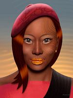Niet alleen de gouden lippen trekken de aandacht van dit werk, maar ook de zeer sprekende ogen. Let ook op het detail van de tatoeage op het gezicht.