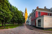 Zicht op de Martinitoren vanaf het Martinikerkhof in het centrum van de stad Groningen. De ondergaande zon verlicht de Martinitoren met een gouden gloed.