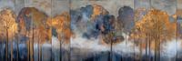 Gouden Nevel - Dit werk is een perfecte wanddecoratie voor een moderne woonkamer, een lichte hal of een rustige leeshoek waar je de spanning tussen stilte en diepte wil benadrukken. Als wanddecoratie in een designgerichte woning voegt dit bomen schilderij meteen warmte toe zonder te schreeuwen: het werkt goed boven een lage bank, in een…