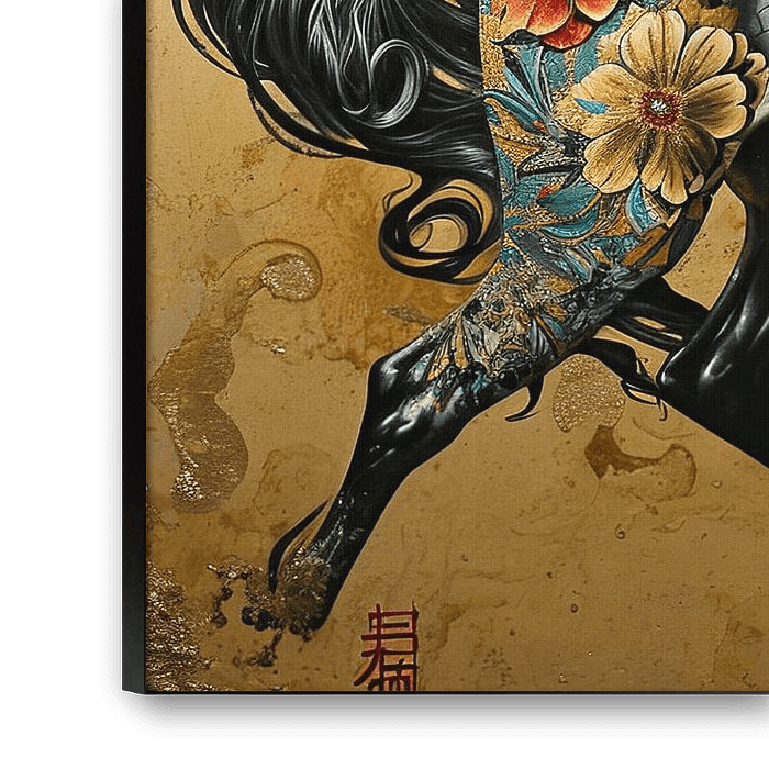 Details: paard, bloemen, vogels, galopperen, goud, beige, zwart, decoratief, dynamisch, luxe, Warm glow