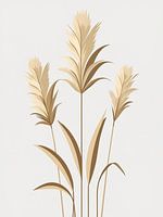 Een verfijnde illustratie met drie stengels pampagras met vloeiende goudbeige pluimen en sierlijk gebogen bladeren in warme neutrale tinten. De organische, vloeiende compositie vangt de elegante beweging van de plant. Perfect voor moderne boerderijdecoraties, herfstthema's, neutrale interieurontwerpen of eigentijdse botanische…