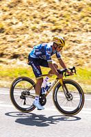Prachtige foto van Remco Evenepoel op zijn gouden fiets. Tevens op de foto een gouden achtergrond van gras en een prachtige schaduw van Remco op de weg.