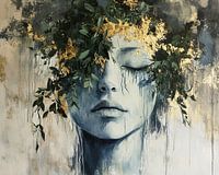 Gouden Rust - Dit vrouwen schilderij toont het portret van een vrouw wiens hoofd sierlijk bedekt is met bladeren en bloemen, overgoten met vleugjes glinsterend goud en gehuld in zachte, kalmerende blauwtinten, wat een vredige en bijna dromerige uitstraling geeft.