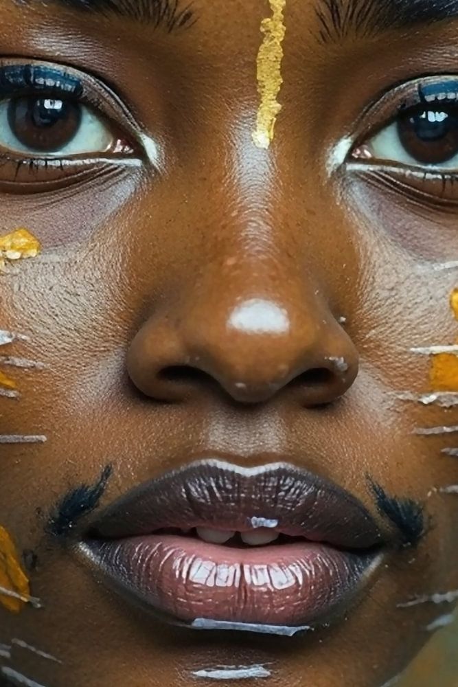Dit schilderij vangt de kracht en elegantie van een donkere vrouw, wier gezicht is gehuld in een artistieke gloed van gouden verfstrepen, subtiel verweven met witte accenten. De harmonie tussen licht en schaduw, tussen abstractie en realisme, creëert een diep mysterieuze en hypnotiserende uitstraling die de kijker blijft boeien.