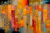 De compositie is opgebouwd uit verticale vormen die samen een skyline vormen. Warme tinten domineren het beeld, terwijl koele blauwen en grijzen de stad diepte en structuur geven. De gouden patronen lichten overal op en trekken de blik door de hele voorstelling.