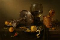 Een klassiek stilleven geïnspireerd op de oude meesters, met een harmonieuze compositie van fruit, tinnen borden en gegraveerde drinkbekers. De rijke kleuren, verfijnde lichtval en symboliek maken dit werk tot een ode aan vergankelijkheid en overvloed.