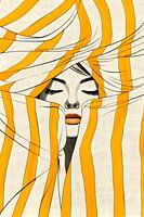 Dit grafische figuratieve kunstwerk toont een sereen vrouwengezicht omlijst door vloeiende goudgele strepen. Het lineaire ritme en minimale kleurenpalet creëren een opvallend contrast tussen zachtheid en structuur. De gesloten ogen en kalme uitdrukking roepen introspectie, stilte en innerlijke balans op, wat resulteert in een gedurfd…