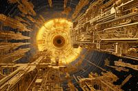 In dit fascinerende werk worden we meegenomen naar een futuristische wereld, waar gigantische constructies zich uitstrekken naar een felverlichte, gouden kern. De ingewikkelde details van de architectuur, met hun talloze leidingen en structuren, creëren een gevoel van diepte en complexiteit. Het licht dat uit de centrale kern straalt, suggereert een bron van immense energie en mysterie.
