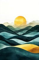 Dit abstracte berglandschap toont een serene zonsopgang met vloeiende lijnen die gelaagde bergen vormen in groen en blauw, terwijl een gouden zon oprijst. Het contrast tussen koele valleien en warm zonlicht creëert harmonie en een gevoel van ontwaken. Gestileerde vormen en kleurgebruik roepen rust en verwondering op, uitnodigend tot…