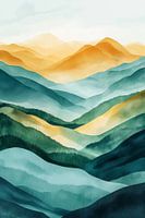 Dit abstracte berglandschap combineert warme gouden tinten met koele groenen en blauwen, wat een harmonieus contrast creëert tussen zonsopgang en schaduwrijke valleien. De vloeiende, golvende lijnen van de bergen suggereren een sereen en dromerig tafereel. Gelaagde, mistige contouren geven diepte en mysterie aan de compositie. Het kunstwerk balanceert tussen abstractie en herkenbare natuurelementen, waardoor een gevoel van rust en verwondering wordt opgeroepen. De zachte overgangen tussen kleuren en vormen nodigen de kijker uit om zich onder te dompelen in de vredige schoonheid van een ochtend in een weids berglandschap.