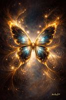Gouden Transformatie verbeeldt de kracht van verandering en verfijning. De vlinder, opgebouwd uit vloeiende lichtlijnen en gouden accenten, lijkt te zweven in een donkere, kosmische ruimte. Het contrast tussen diep blauw en warm goud creëert een luxueuze uitstraling die zowel rust als energie uitstraalt.