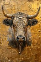Een krachtig portret van een stier, meesterlijk uitgevoerd tegen een glanzende, goudkleurige achtergrond. De verfijnde details in de hoorns, de robuuste vacht en de indringende blik benadrukken de kracht en trots van het dier. De gestructureerde achtergrond met rijke penseelstreken voegt diepte en een luxueuze uitstraling toe. Dit…
