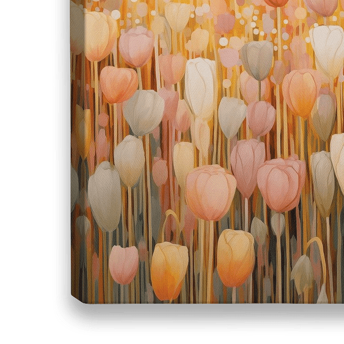 "Gouden Tulpen" is een digitaal schilderij van het veld met bloemen met gouden bokeh. Het werk geeft een warme elegante uitstraling aan uw interieur!