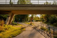 Fietspad onder een betonnen brug in warm avondlicht met lange schaduwen van het hekwerk en een groene fiets tegen de reling.