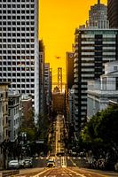 Iconische foto en stadsgezicht van San Francisco (Californië) tijdens het begin van het gouden uur en zonsopgang. De Oakland Bay Bridge van San Francisco is te zien op de achtergrond. Deze foto is genomen op California Street.