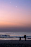 Een verstild moment aan de kust, gevangen tijdens de magische overgang van dag naar nacht. Dit beeld, 'Gouden Uur van de Generaties', toont drie silhouetten – een volwassene en twee kinderen – die uitkijken over een kalme zee. Hun gedeelde stilte wordt omarmd door een adembenemende lucht, die vloeiend verloopt van diep violet en roze…