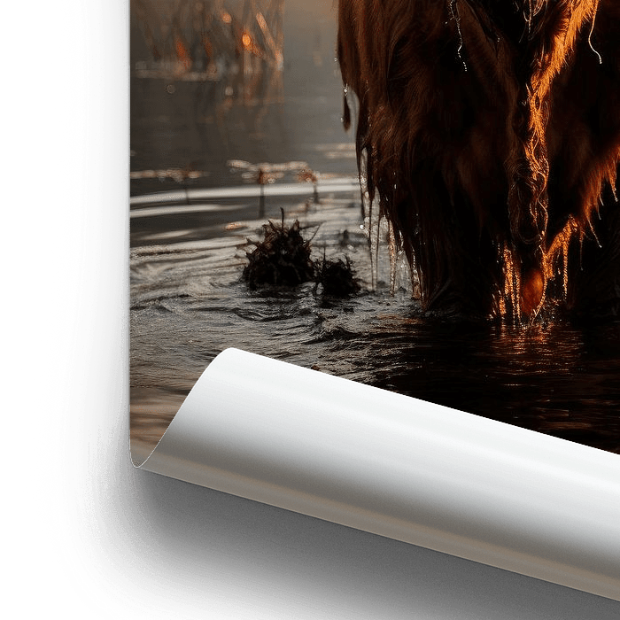 Laat je betoveren door het magische Gouden Uurtje met deze adembenemende foto van een Schotse Hooglander die in het water staart. Het warme, gouden licht van de ondergaande zon omhult het tafereel en werpt een betoverende gloed over de imposante gestalte van dit majestueuze dier. De reflectie in het kalme water voegt een extra dimensie toe aan de compositie, waardoor het geheel een sfeer van rust en sereniteit uitstraalt. Met zijn krachtige uitstraling en onweerstaanbare charme is deze foto een onvergetelijk kunstwerk dat de tijd lijkt stil te zetten. Breng de magie van het Gouden Uurtje in huis en laat je verrassen door de schoonheid van deze Schotse Hooglander.