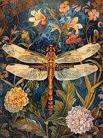 De achtergrond is een diepblauwe hemel, verrijkt met een delicate werveling van florale en botanische motieven, die een mystieke, bijna droomachtige sfeer schept. De libelle, met haar…