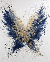 Een serene abstracte vlinder gevormd door gouden en navy blauwe verfspetters op een helder witte achtergrond. De subtiele textuur en lichte diepte zorgen voor een moderne, rustige uitstraling die moeiteloos in elk interieur past.
