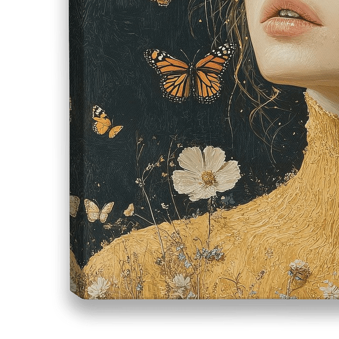 Details: portret, vrouwenportret, bloemen, vlinders, realisme, vrouw, goud, natuur, schoonheid, kunst