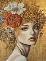 Gouden Vrouw | Bloemen - Dit vrouwenportret schilderij presenteert een vrouw met een opvallend kapsel rijk aan bloemige elementen tegen een goudkleurige achtergrond die een gevoel van luxe en detail benadrukt.