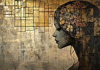 Gouden Vrouw | Vrouw Goud - In dit vrouwen schilderij zie je een stilistisch zijprofiel van een vrouw met gesloten ogen en een bloemrijk motief in haar hoofd, uitgevoerd als modern abstract schilderij met geometrische gouden vlakken en ingetogen beige aardetinten, een vrouw schilderij dat rust en textuur uitstraalt.