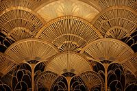 Dit werk toont een verzameling van waaiervormige patronen in verschillende tinten goud en bruin. De symmetrische en gelaagde waaiers creëren een gevoel van elegantie en ritme. De compositie is geïnspireerd door art-deco stijlen en natuurlijke elementen zoals schelpen en waaiervormige bladeren.