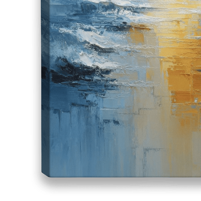 Een abstract olieverfschilderij van de zee in zachte blauwe en gele tinten. De zonsondergang baadt het tafereel in gouden licht en wordt vredig weerkaatst op het wateroppervlak. Grote, levendige penseelstreken creëren beweging en diepte, terwijl de mistige horizon rust en harmonie uitstraalt. Dit kunstwerk vangt de magie van het gouden…