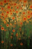 Dit werk toont een veld van zonnebloemen die lijken te baden in gouden licht. De levendige oranje en rode bloemen contrasteren prachtig tegen de groene achtergrond, waardoor een warm en uitnodigend tafereel ontstaat. De verticale lijnen van de bloemenstelen geven een gevoel van hoogte en beweging, alsof de zonnebloemen zich uitstrekken naar de zon. Dit werk brengt een gevoel van vreugde en energie in elke ruimte en is een prachtige toevoeging aan zowel moderne als klassieke interieurs.