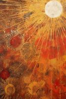 Dit werk toont een stralende zon die haar licht over een abstract landschap van warme, goudgele en roodoranje tinten werpt. De zonnestralen stralen vanuit het middelpunt naar alle kanten en creëren een gevoel van warmte en energie. De ondergrond heeft gedetailleerde patronen die doen denken aan bloemen en planten, waardoor een harmonieus geheel ontstaat. Dit werk brengt een vleugje zonneschijn en vreugde in elke ruimte en is perfect voor zowel moderne als klassieke interieurs.