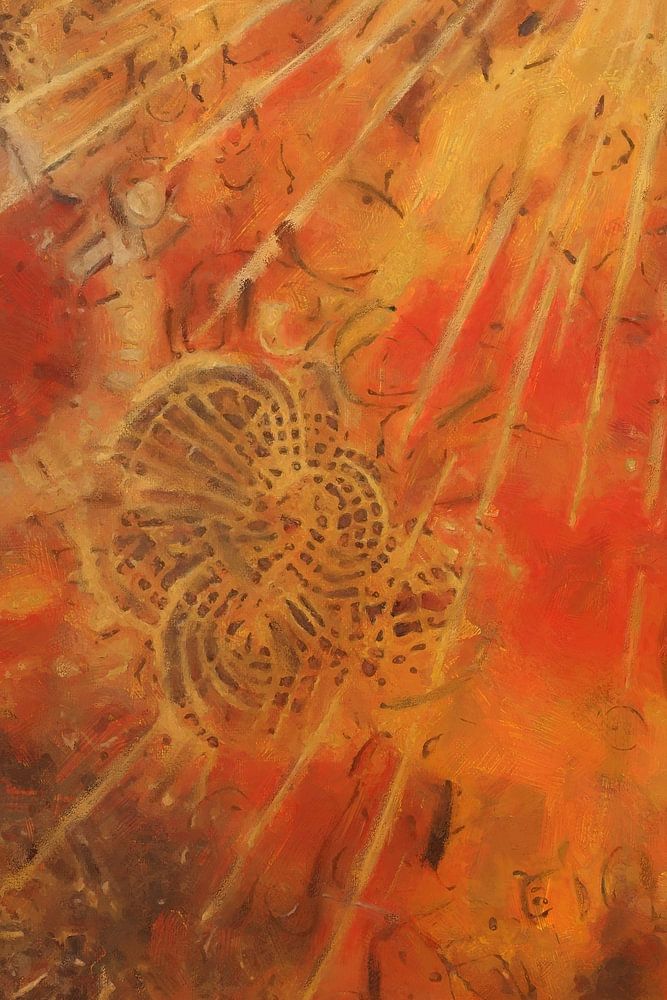 Dit werk toont een stralende zon die haar licht over een abstract landschap van warme, goudgele en roodoranje tinten werpt. De zonnestralen stralen vanuit het middelpunt naar alle kanten en creëren een gevoel van warmte en energie. De ondergrond heeft gedetailleerde patronen die doen denken aan bloemen en planten, waardoor een harmonieus geheel ontstaat. Dit werk brengt een vleugje zonneschijn en vreugde in elke ruimte en is perfect voor zowel moderne als klassieke interieurs.