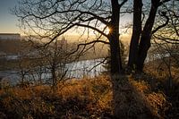 Warm avondlicht in de winter, net voor zonsondergang. Gouden zonnestralen schijnen van achter een boom. De stammen en vertakkingen van de takken verschijnen als donkere silhouetten in het landschap. Op de achtergrond is de historische architectuur van de stad Pirna en de rivier de Elbe te zien.