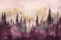Dit prachtige kunstwerk combineert de kracht van de natuur met een vleugje abstractie. Een sprookjesachtige combinatie van gouden bergen en een mysterieuze paarse bosomgeving creëert een unieke sfeer. De zachte mist tussen de bomen en bergen voegt een serene en magische uitstraling toe, perfect voor een moderne inrichting. Dit ontwerp…