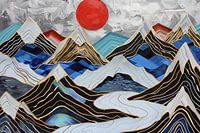Deze betoverende schilderijen combineren de elementen van het berglandschap met een moderne, abstracte esthetiek. De gouden bergtoppen gloeien tegen een dramatische achtergrond van blauwe en zwarte tinten, terwijl een intens rode maan de hemel domineert. De vloeiende lijnen en het harmonieuze kleurenpalet van goud, blauw en rood creëren…