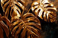 Gladde, glanzende gouden monsterabladeren glinsteren majestueus in het licht en voegen een vleugje elegantie toe aan elke kamer. Hun luxueuze afwerking contrasteert indrukwekkend met de donkere achtergrond, terwijl de filigrane bladstructuren de combinatie van natuur en kunst vieren. Er ontstaat een fascinerend spel van licht en schaduw dat uitnodigt tot verwondering.