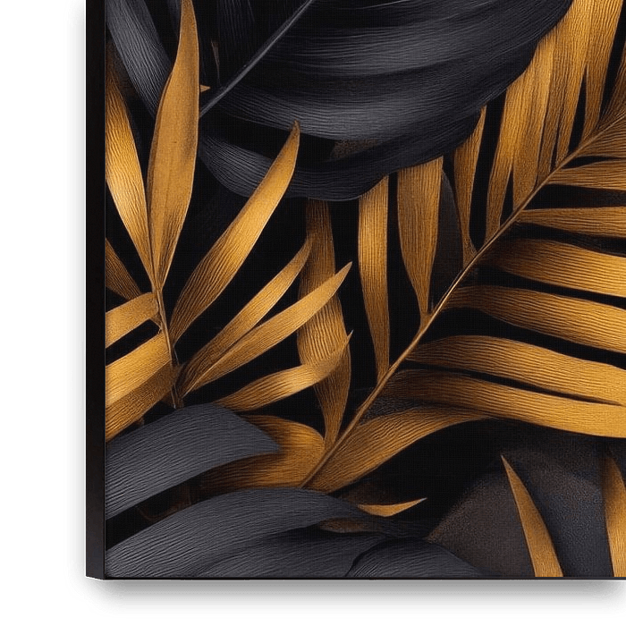Een glinsterend samenspel van gouden bladeren, die elegant afsteken tegen een diepzwarte achtergrond, creëert een luxueuze sfeer. De zachte rondingen en fijne details van de bladeren geven het geheel een vleugje exotisme en verfijning, alsof natuur en glamour samen dansen. Een visueel feest voor de kijker!