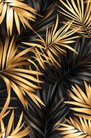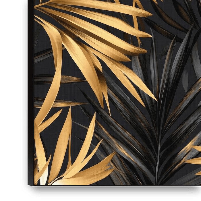 Een weelderig samenspel van gouden palmbladeren en diepe, donkere tinten ontvouwt zich voor de kijker. De glinsterende bladeren dansen sierlijk in contrast met de mysterieuze achtergrond en nodigen je uit om je onder te dompelen in een exotische wereld van luxe en elegantie. Een fascinerend spel van licht en schaduw ontvouwt zich en…