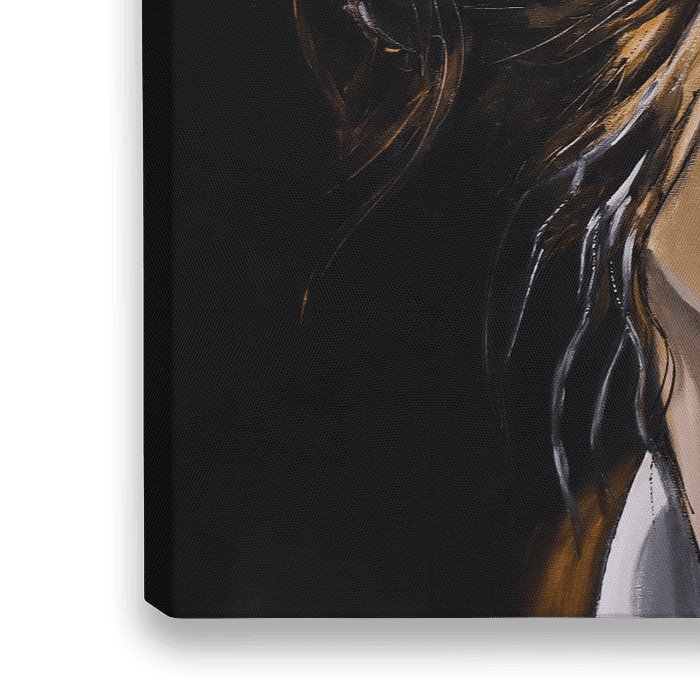 Dit indrukwekkende portret toont een beeldschone vrouw, gevangen in een moment van elegante contemplatie. Haar gezicht, omlijst door donkergetinte kleuren en subtiele gouden accenten, straalt een delicate en toch krachtige uitstraling uit.
