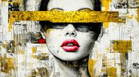 Dit werk confronteert de kijker met gespannen symboliek: een smetteloos gezicht, expressieve rode lippen - en een massieve gouden structuur die de ogen bedekt. De staaf gebarsten goud met textuur fungeert als een ondoordringbare barrière die het zicht en de waarneming in gelijke mate beperkt. Het lijkt zowel een teken van rijkdom als…