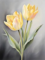 Dit kunstwerk vangt de delicate schoonheid van twee gele tulpen in volle bloei. Zachte, botergele bloemblaadjes met subtiele roze en witte vleugjes ontvouwen zich sierlijk tegen een grijze achtergrond. De gladde, slanke stengels en zacht gebogen groene bladeren dragen bij aan de elegante eenvoud van de compositie en roepen een gevoel op…