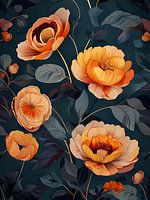 Een betoverend bloemstuk in warme amber- en goudtinten tegen een diep groenblauwe achtergrond. Dit stuk roept een gevoel van herfstige schoonheid en rust op.