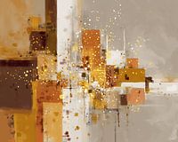 Gouden blokken | Golden Light Grid - Dit abstract schilderij toont een modern, geometrisch centrum van warme blokken en vierkanten met daarop fonkelende gouden spatten en lichtpuntjes, waardoor het schilderij abstract, levendig en sfeervol overkomt; ideaal als abstract schilderij of schilderij abstract voor wie zoekt naar blokken en…