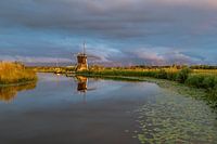 Deze foto is gemaakt bij UNESCO werelderfgoed Kinderdijkse molens (Zuid-Holland, Nederland). Heel de dag was het regenachtig weer, maar rond zonsondergang brak de lucht even open en spreidde de zon haar laatste gouden stralen. In combinatie met de dreigende luchten van de regen, geeft dit mooie contrasten. Het zonlicht zorgt voor een…