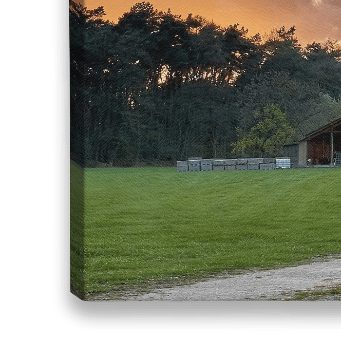 Een boerderij in de Achterhoek onder een gouden wolkenlucht tijdens zonsondergang.