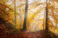 Een wandeling door het magische herfstbos. De zon vecht zich een weg door de mist en laat de bladeren goudgloeien. Bosbaden in de herfst.